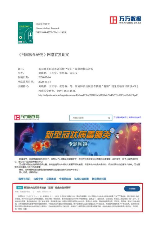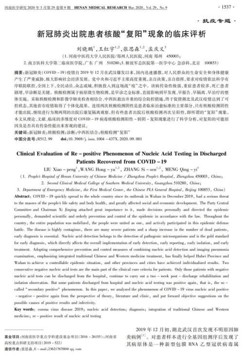 On March 14th, 2020, Henan Medical Research published “Clinical Evaluation of Re-positive Phenomenon of Nucleic Acid Testing in Discharged Patients Recovered from Covid-19” online. This paper focuses on the re-positive phenomenon of nucleic acid testing in some discharged patients recovered from Covid-19. Based on authoritative literature and clinical research results, it has carried out scientific professional analysis and offered further treatment for the patients. This is very significant for the prevention and control of Covid-19 and for the management of discharged patients. The author of this paper is Liu Xiaopeng, a postgraduate student of the Fifth Clinical Medical School of our university, Wang Hongyu, a doctoral student of the Second Clinical Medical College of Southern Medical University, and Professor Meng Qingyi of the first medical center of the Chinese PLA General Hospital. The corresponding author is Professor Zhang Sisen, director of the cardiopulmonary cerebral resuscitation research center, Vice President of the Affiliated People's Hospital and doctoral supervisor of our university. The papar is hereby forwarded.